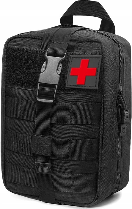Apteczka w kolorze czarnym jest bardzo pojemna i wyposażona w liczne przegródki, w tym jedną zamykaną na zamek, co ułatwia organizację zawartości. Na przodzie znajduje się klamra zabezpieczająca przed przypadkowym otwarciem, a także czerwona naszywka z krzyżem na rzepie, co pozwala na szybką identyfikację apteczki w sytuacjach awaryjnych.